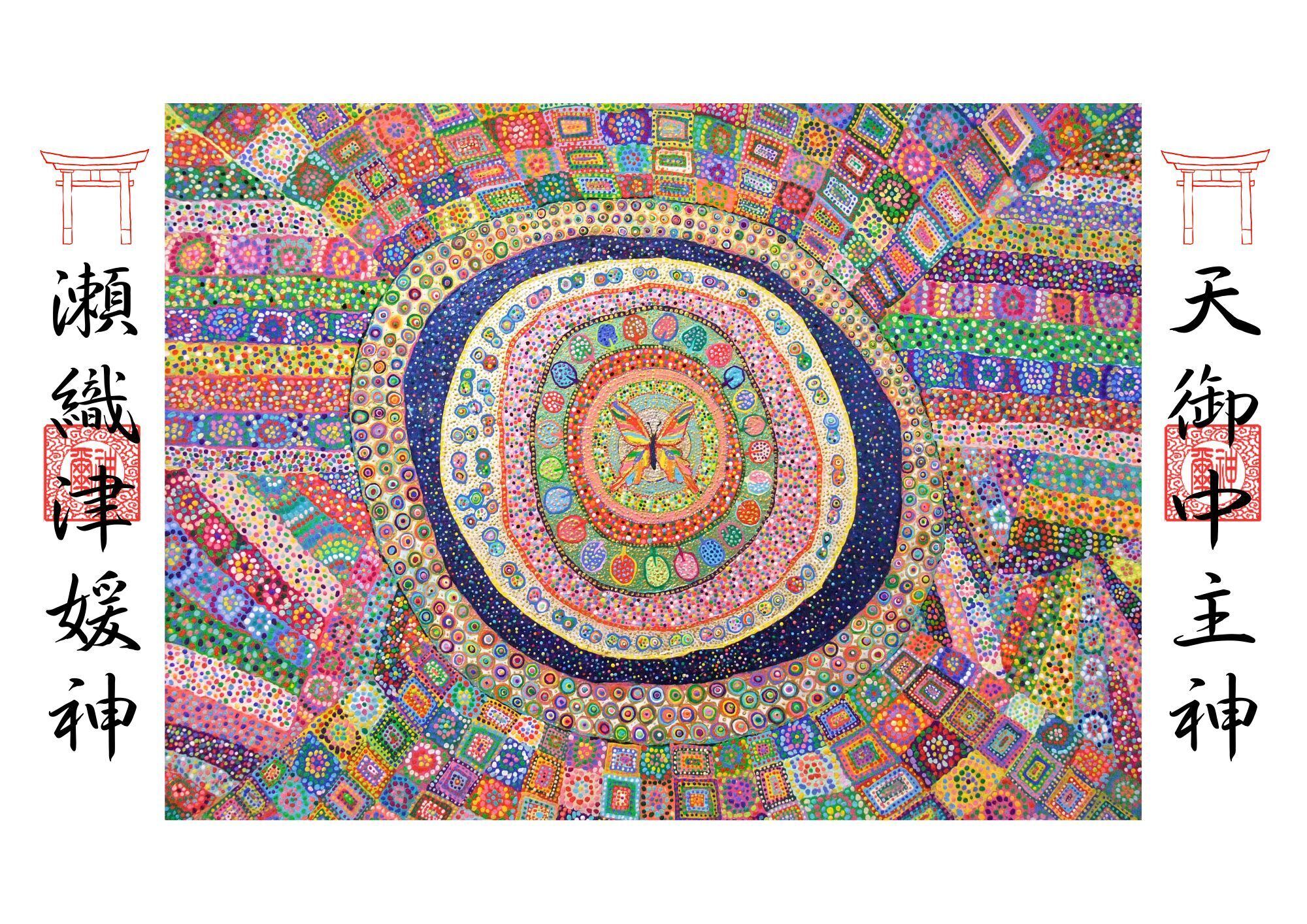宇宙創造神である天御中主神(男神)と瀬織津媛神(女神)統合神が宿られています。楠家の氏神でもあられる、天御中主神と瀬織津媛神の御神威、御神徳がこもった絵画です。祖霊、御霊、荒魂、和魂の御神威が込められています。